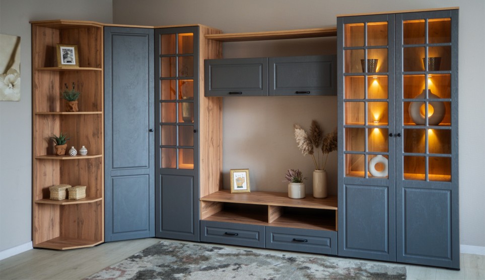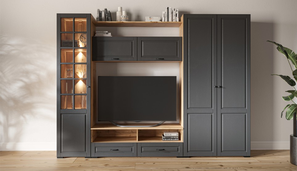 Функциональная стенка с лаконичными фрезерованными фасадами – это неоклассика с природными скандинавскими мотивами. Сочетание глубокого серого цвета с натуралистичной фактурой теплого дерева выглядит органично и естественно.