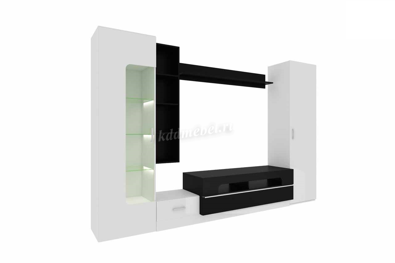 Черно-белое сочетание, впишет гостиную Лофт-20 в любой интерьер. А теплый свет подсветки в полках и нише тумбы создаст дополнительный уют.