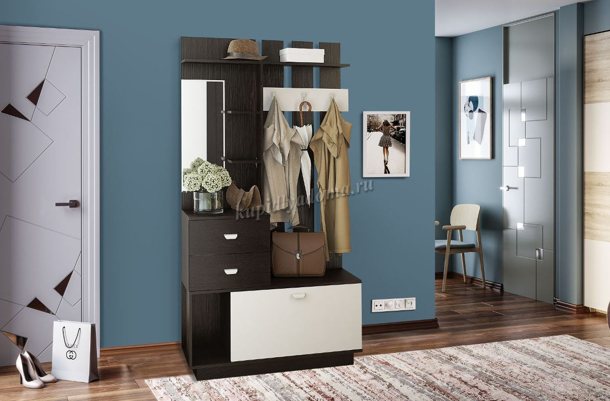 Эффективное решение для небольшой прихожей — это «Вега ». Несмотря на компактные размеры, мебель включает в себя всё необходимое для аккуратного хранения одежды и повседневных мелочей. Прихожая оснащена вместительным отсеком для обуви, ящиками, а также полками для аккуратного хранения повседневных мелочей и головных уборов.