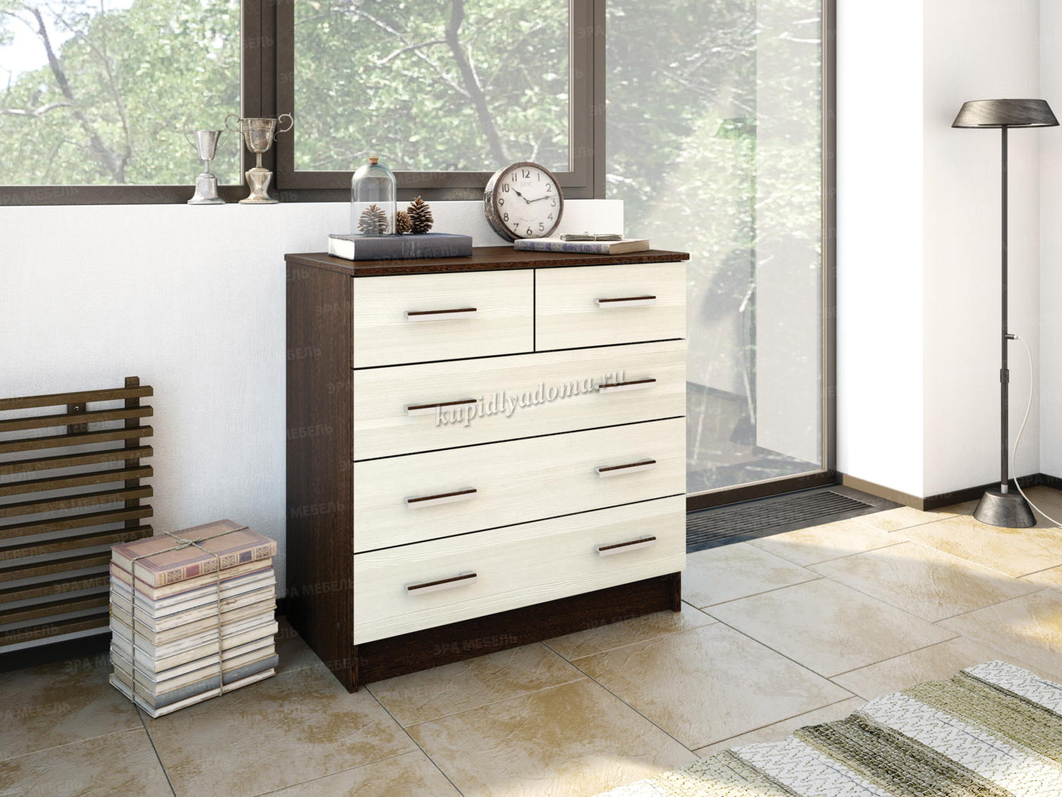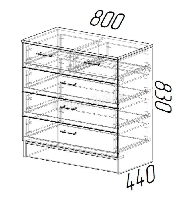 Комод оснащён пятью выдвижными ящиками (3 больших и 2 маленьких).