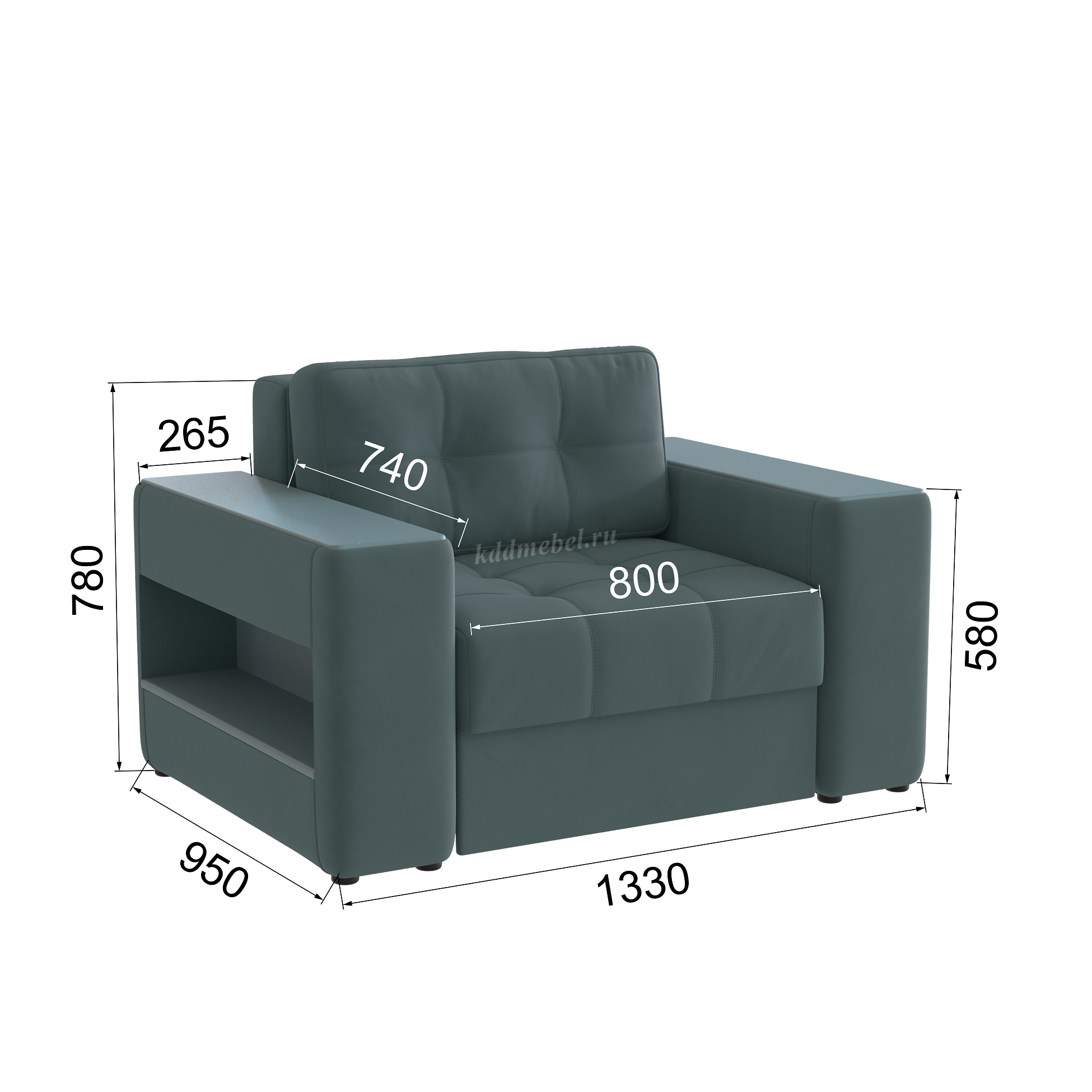 Подлокотники шириной 265 мм, обтянутые тканью и простеганные двойной отделочной декоративной строчкой.