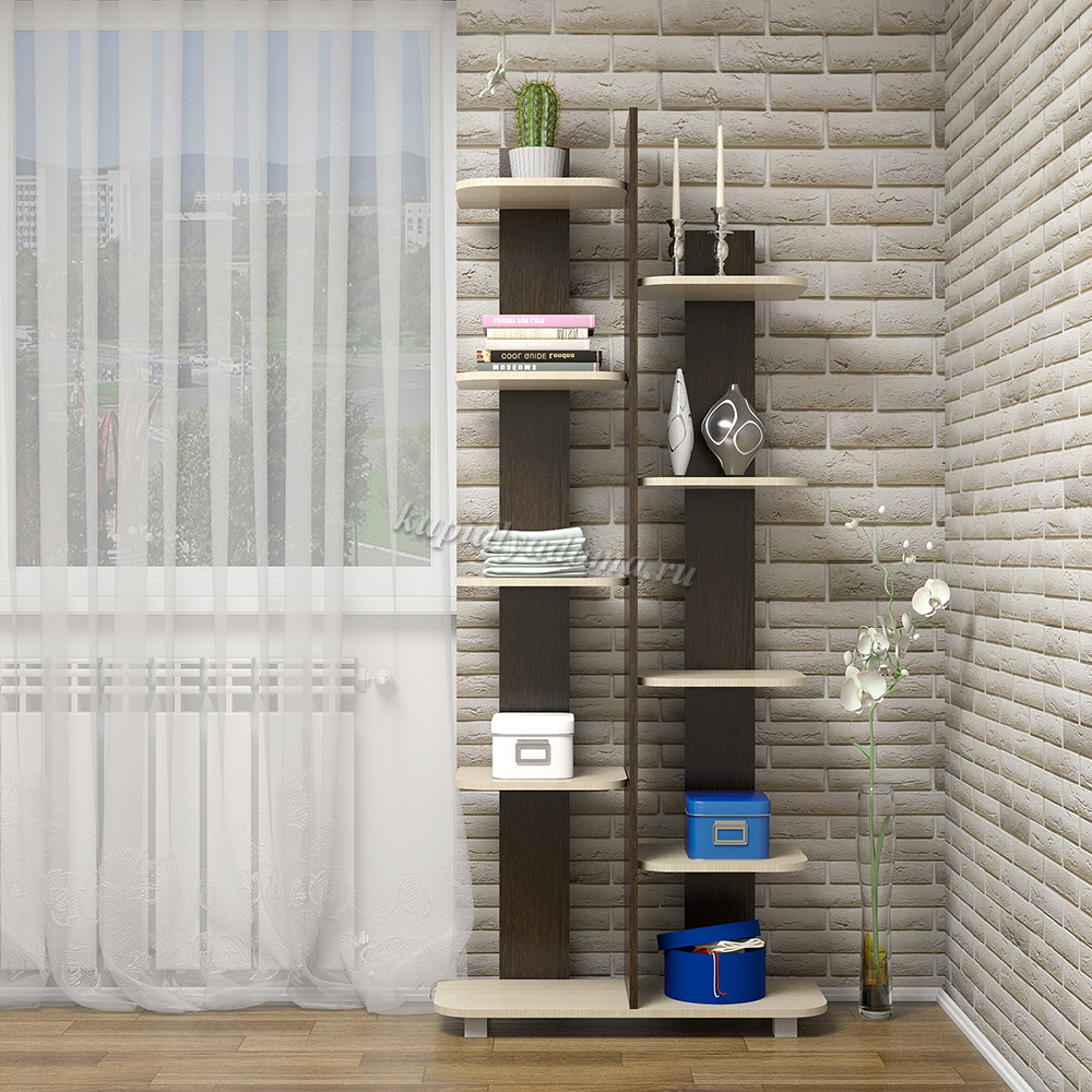 Этот стеллаж придется по вкусу тем, кого заботит создание оригинального интерьера и сохранение свободного пространства. На полках найдется место самым любимым вещам и сувенирам, которые придадут интерьеру индивидуальный оттенок, а сам стеллаж станет им отличным фоном, не теряя свою неповторимость.